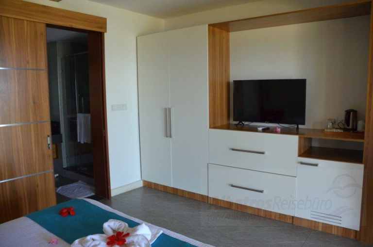 Die Standard Seafacing Zimmer befinden sich auf der Meerseite (ca. 26 - 30 qm, mit hellem Holzinterieur ausgestattet, Bad mit Dusche, WC, Bademantel, Telefon, TV, Minibar, Klimaanlage, Balkon oder Terrasse.