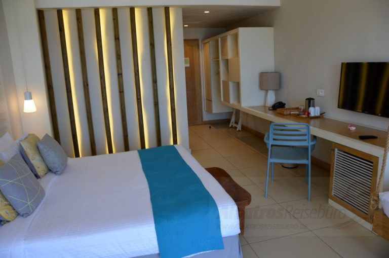 Die Deluxe Zimmer verfügen über ca. 40 qm Wohnraum, sind ausgestattet wie Superior, aber mit Terrasse. Ein Blick auf den Pool oder eine eingeschränkte Sicht auf das Meer sind möglich. Die Deluxe Seafront Zimmer sind ca. 40 qm groß und sind ausgestattet wie die Deluxe Zimmer. Sie verfügen über einen Balkon und Meerblick.