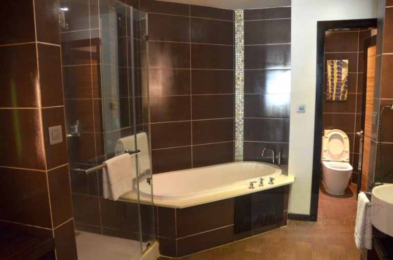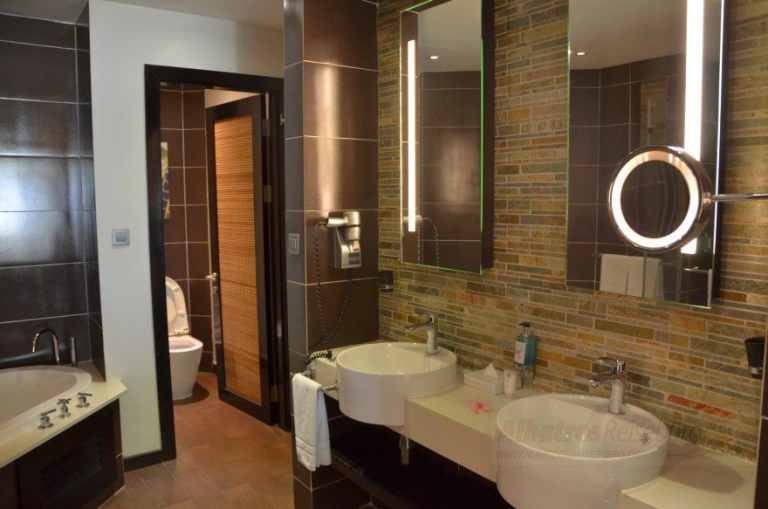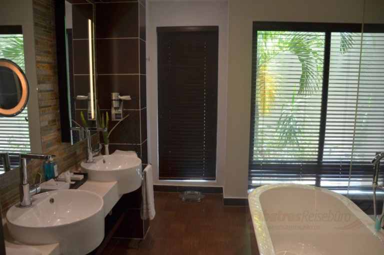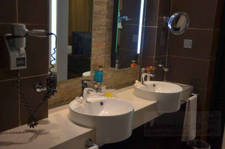 Das Badezimmer der Privilegen Zimmer (40-44 qm) ist durch eine Schiebetür vom Schlafbereich getrennt und kann geöffnet werden. Die Prestige Zimmer (58 qm) sind zusätzlich mit Bidet und einem teilweise begehbaren Kleiderschrank ausgestattet.