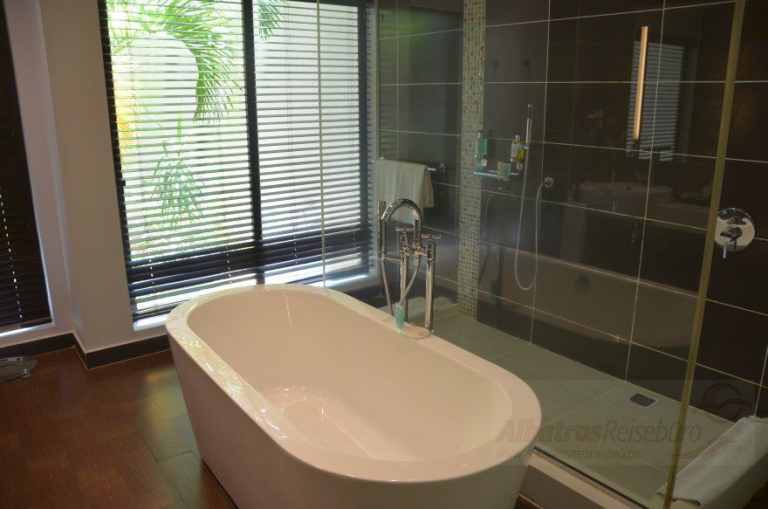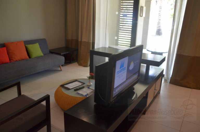 Hochwertiger eingerichtet sind die Junior Suiten (75 qm). Sie haben zusätzlich noch einen Whirlpool, eine größere Terrasse/Balkon und eine Kaffeemaschine.