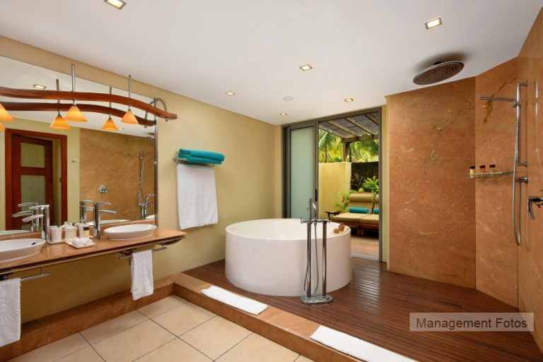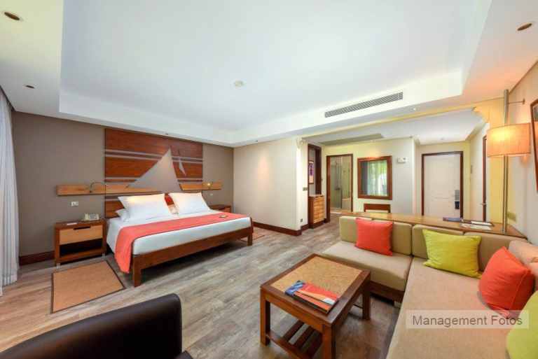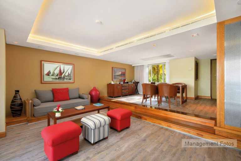 Die Senior Suiten (110 qm) haben zusätzlich noch ein separates Wohnzimmern, einen Balkon und über eine Treppe Zugang zum Strand. Über ein separates Kinderzimmer (3 Kinder bis 17 Jahre) mit Etagenbett, Duschbad und WC verfügen die 2 Bedroom Family Apartments (ca. 75 qm).