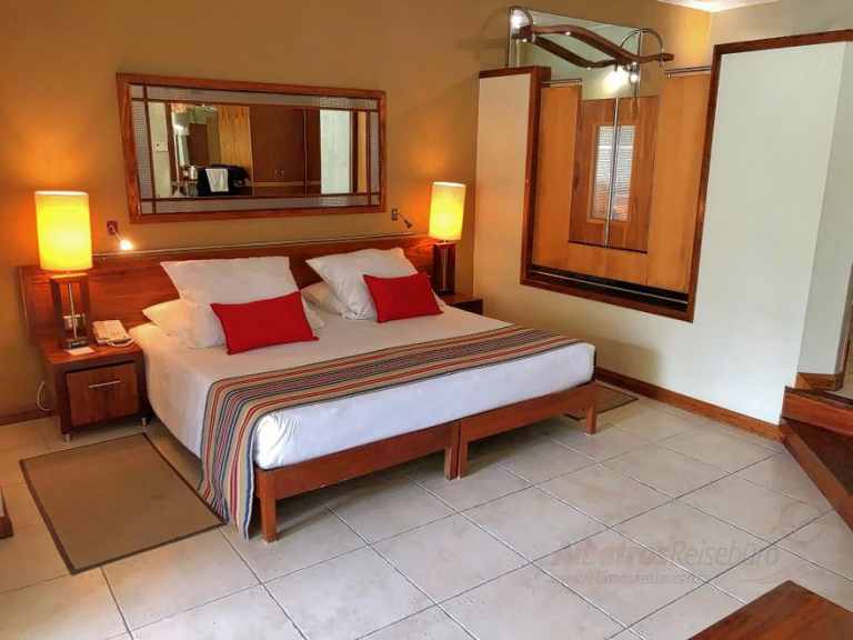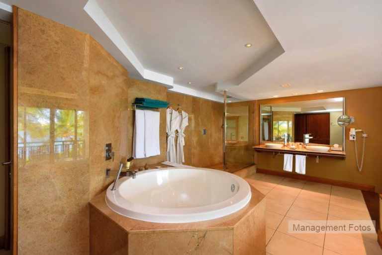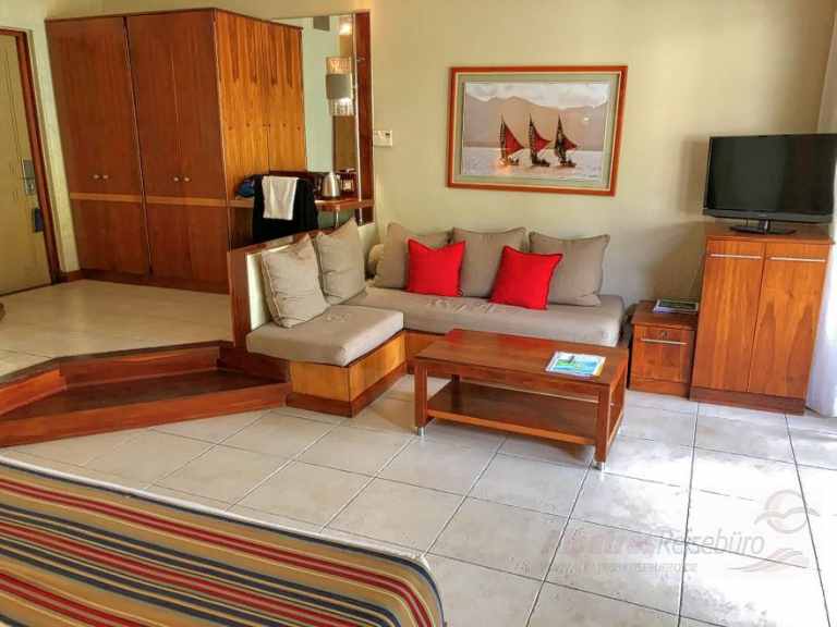 Superiorund Promo Zimmer (ca. 50 qm) sind modern und haben ein Schlafzimmer, das 1 Stufe tiefer liegt, Badewanne, Föhn, Dusche, separates WC, Telefon, Minibar, Sat.-TV, Safe, Klimaanlage, Tee-/Kaffezubereiter und eine Terrasse o. Balkon zur Lagunen- oder Meerseite.